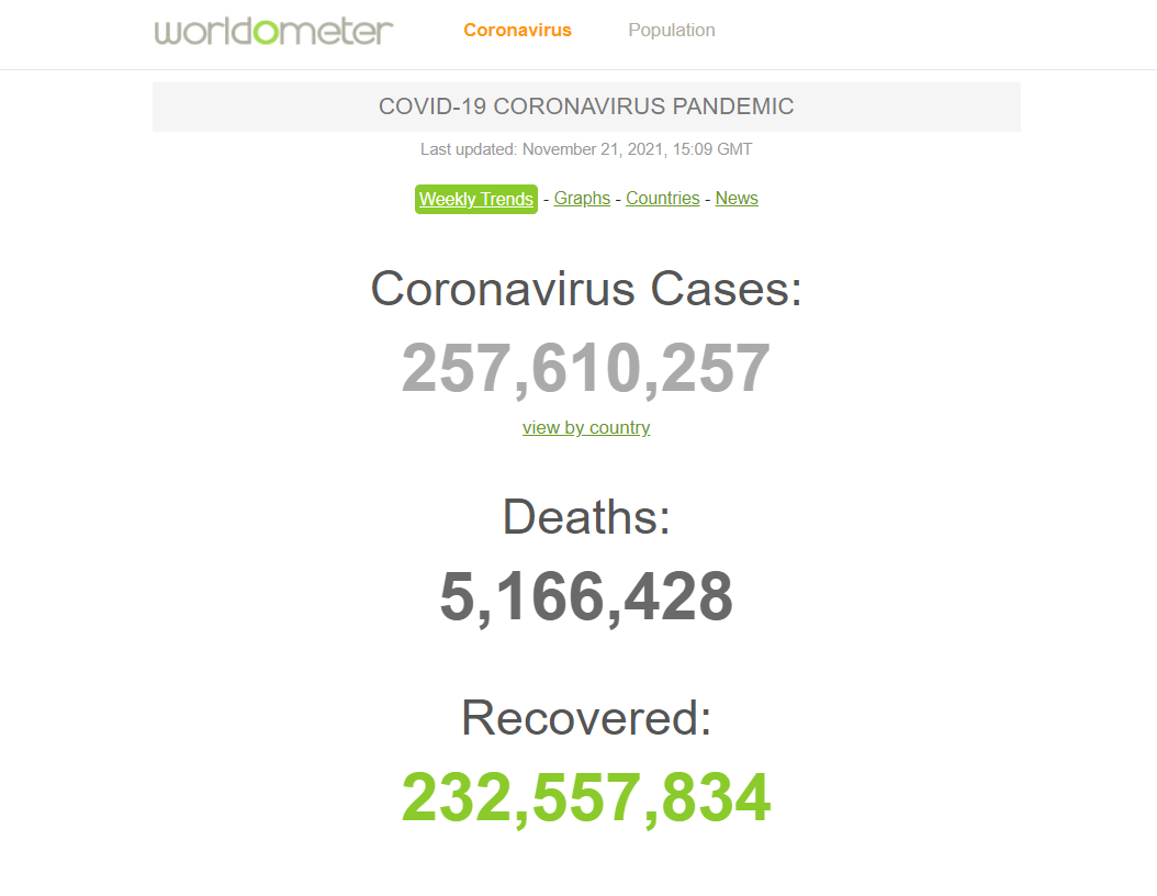 Состоянием на утро 21 ноября, воскресенье, всего в мире зафиксировали почти 260 млн случаев заражения коронавирусом (257 458 456).