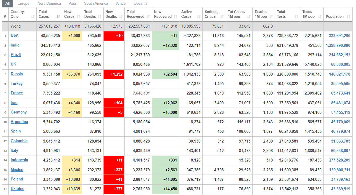 В частности на сегодняшний день подтверждено более 5 млн летальных случая (5 164 174), при этом выздоровели 232 428 208 человек.