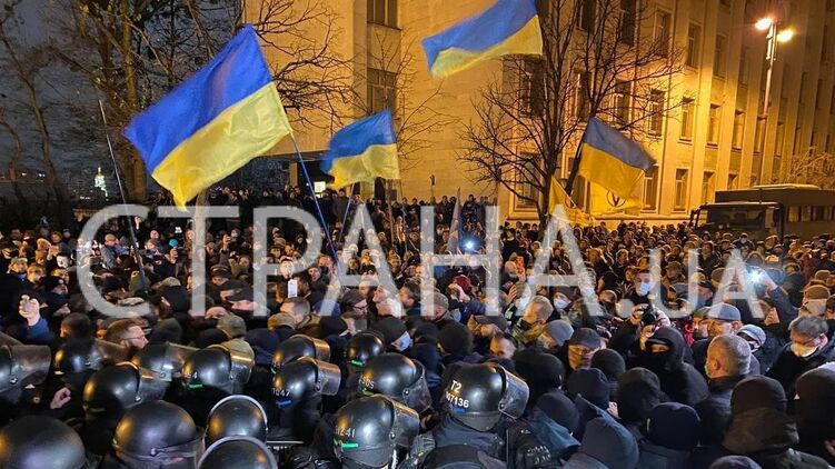 Над толпой разносится "Зелю геть!". К силовикам со стороны Офиса президента подтягивается подмога.