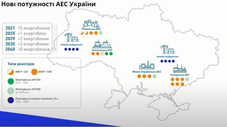 Далее планируется поставить на каждую АЭС (Хмельницкую, Ривненскую, Запорожскую, Южно-Украинскую) еще по одному блоку плюс построить еще две новые атомные электростанции на четыре блока каждая. Но где они будут расположены и по какой технологии будут строить - вопрос пока открытый. В "Энергоатоме" заявили, что на данный момент рассматривают 33 локации под АЭС (какие именно, не уточняется). На карте с презентации "Энергоатома" новые площадки показаны на западе и востоке страны. Но такое размещение может быть чисто условным.