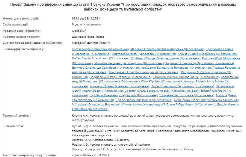 Согласно текущей редакции закона, срок действия особого порядка местного самоуправления в отдельных районах Донецкой и Луганской областей истекает 31 декабря 2021 года.