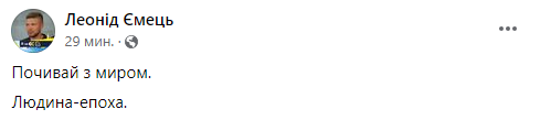 Народный депутат Леонид Емец, который первым сообщил о том, что Омельченко попал в больницу с коронавирусом в тяжелом состоянии, выразил свои слова соболезнования: