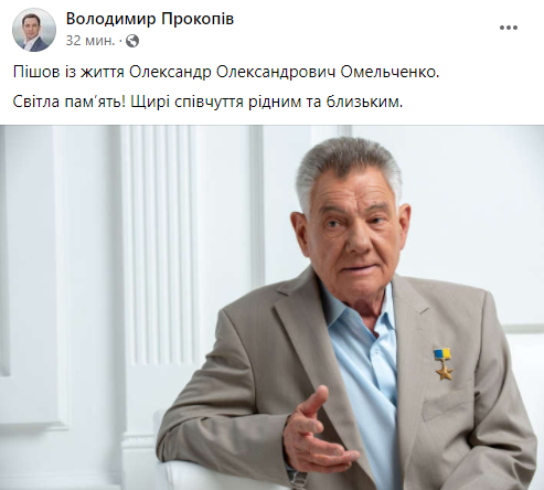 "От нас навсегда ушел Александр Омельченко. Светлая память легендарному человеку и профессионалу. Он был достойным руководителем Киева!