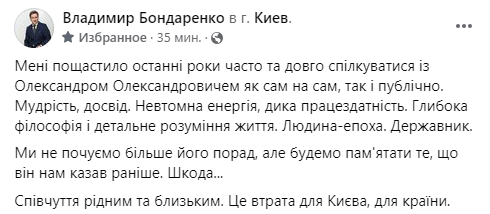 Заместитель Кличко и секретарь Киевсовета Владимир Бондаренко пишет, что знал Омельченко и всегда восхищался его энергичностью и мудростью: