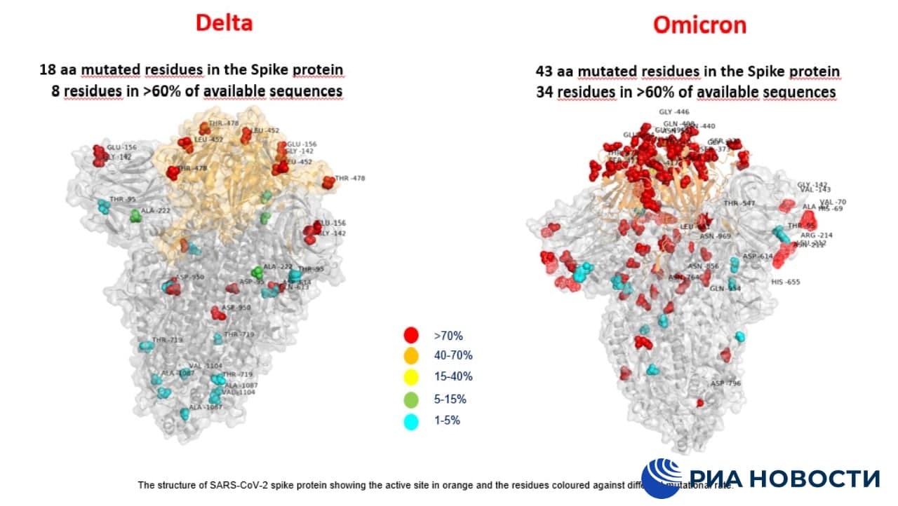 Итальянские ученые показали первое в мире изображение белка нового штамма "омикрон" в сравнении со штаммом "дельта". На изображении "омикрона" выделено множество мутаций.