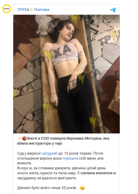 Первым о смерти осужденной сообщил Telegram-канал "ТРУХАЯ Полтава". По его данным, сразу после приговора суда девушка пыталась покончить с собой, порезав вены, но тогда она выжила. А накануне смерти Вероника Моторина целый день ничего не ела, курила и пила кофе. После этого она испытала эпилептический приступ. Сотрудники СИЗО и врачи не смогли спасти ее жизнь.
