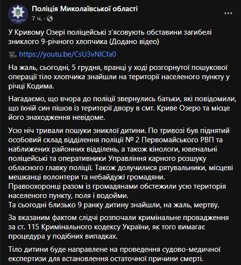 В пгт Кривое Озеро Николаевской области правоохранители выясняют обстоятельства гибели 9-летнего мальчика, тело которого обнаружили сегодня в реке Кодыма.