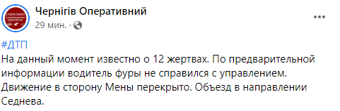 "На данный момент известно о 12 жертвах. По предварительной информации водитель фуры не справился с управлением. Движение в сторону Мены перекрыто. Объезд в направлении Седнева", - сообщает "Чернигов оперативный".