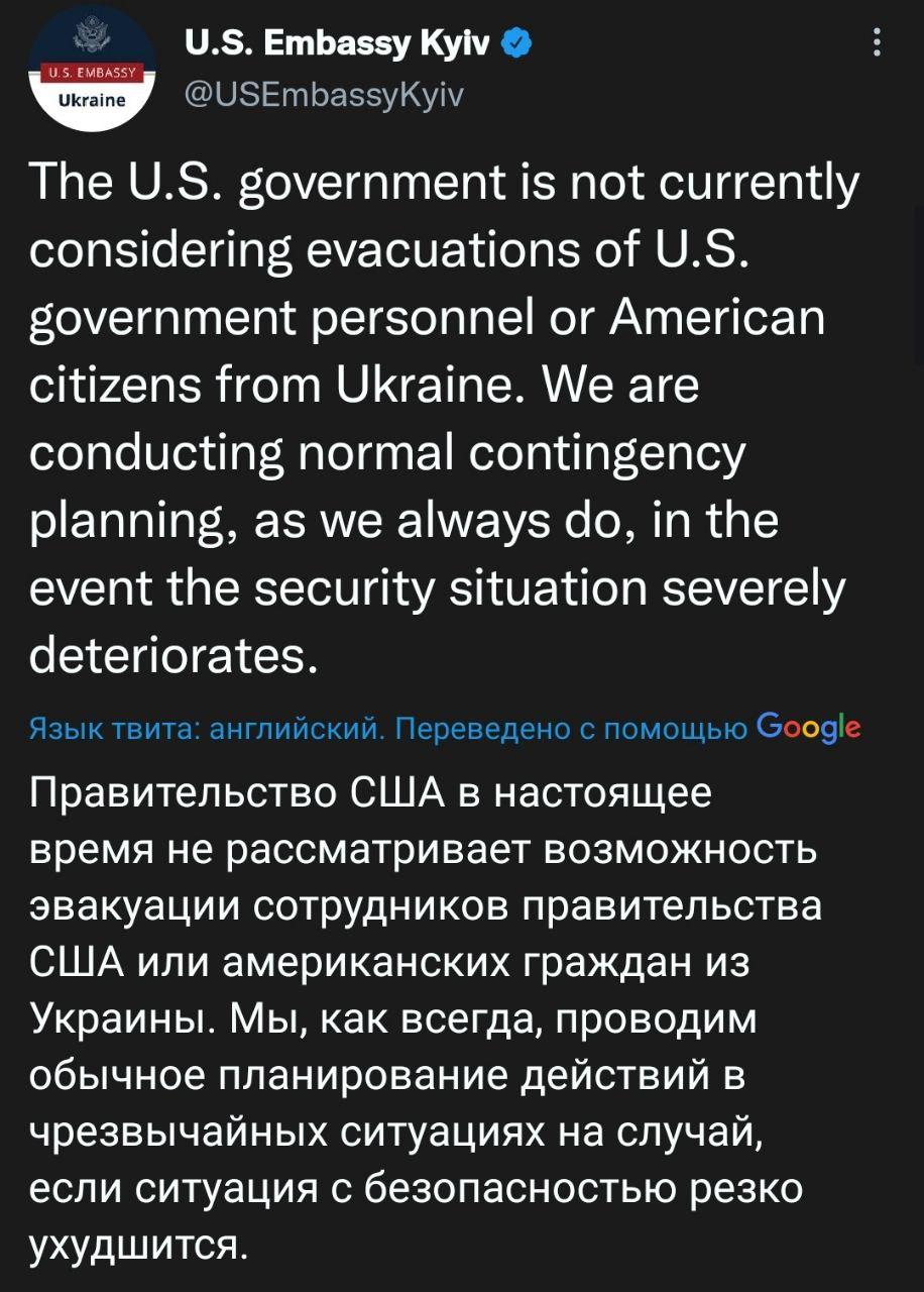 Посольство США в Украине опровергло подготовку к эвакуации, о которой сегодня сообщало CNN.