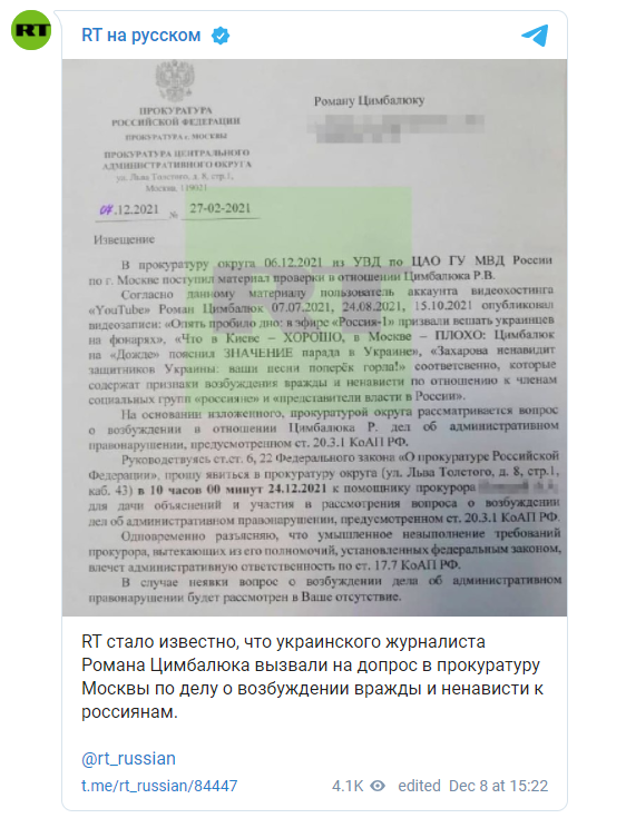 Украинского журналиста, корреспондента УНИАН Романа Цимбалюка вызвали на допрос в прокуратуру Москвы по делу о возбуждении вражды и ненависти к русскому народу.