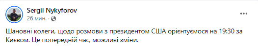 "Уважаемые коллеги по разговору с президентом США ориентируемся на 19:30 по Киеву. Это предварительное время, возможные изменения", - говорится в сообщении.