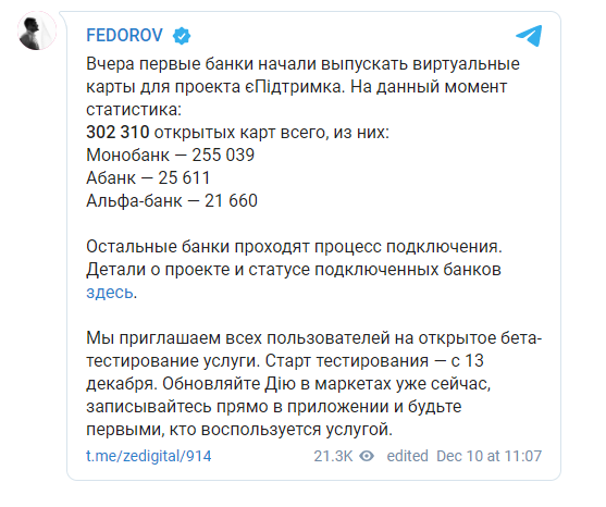 "Вчера первые банки начали выпускать виртуальные карты для проекта "єПідтримка". На данный момент всего 302 310 открытых карт, из них: Монобанк — 255 039, А-банк — 25 611, Альфа-банк — 21 660", - написал Федоров.