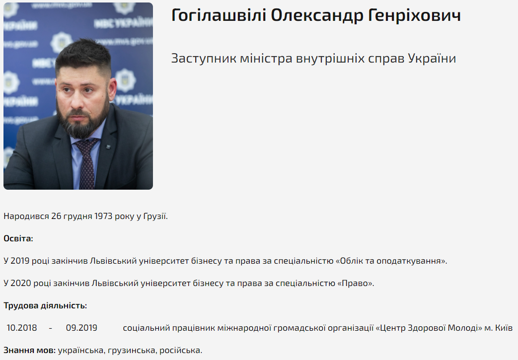 Это человек, который пришел в министерство после победы Зеленского на выборах президента и формирования нового правительства. В этом Кабмине от прошлой власти остался лишь Арсен Аваков, заместителем которого в сентябре и стал Гогилашвили.