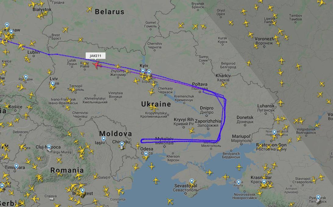 Американский самолёт-разведчик, который с утра кружил над Донбассом, затем несколько часов наматывал петли вдоль черноморского побережья и около границы с Крымом, потом вновь подлетел к Донбассу, а вслед за этим к украинско-российскому участку границы в районе Харьковской области.