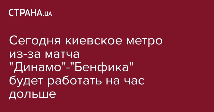 Сегодня ночью работу киевской подземки продлят на один час в связи с проведением на НСК "Олимпийский" футбольного матча в Лиге Чемпионов между командами "Динамо" (Киев, Украина) и "Бенфика" (Лиссабон, Португалия). Об этом сообщает пресс-служба киевского метрополитена.