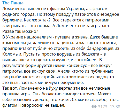 "Ломаченко вышел не с флагом Украины, а с флагом родного города. По этому поводу у патриотов очередное бурление. Как же ж так? Все стараются с патриотами заигрывать – это норма. А Ломаченко не заигрывает. Разве так можно?