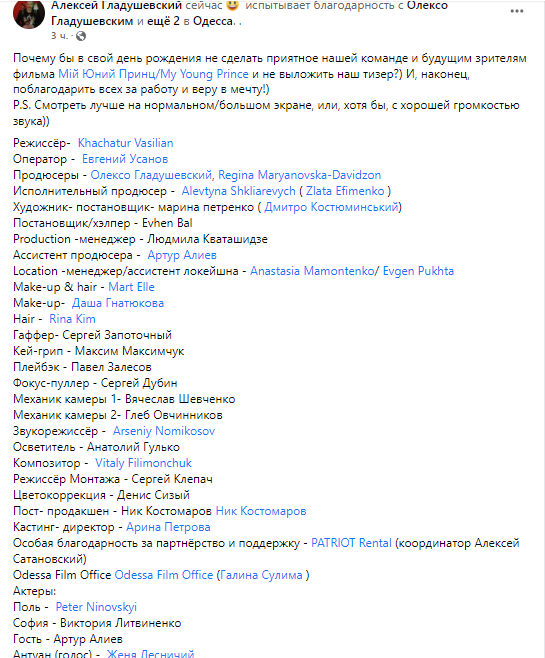 "Почему бы в свой день рождения не сделать приятное нашей команде и будущим зрителям фильма Мой юный принц и не выложить наш тизер?", – написал Гладушевский в Facebook.