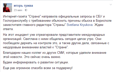 Интернет-газета "Страна" направила запросы в СБУ и Госпогранслужбу с требованием объяснить причины обыска в "Борисполе" заместителя главного редактора "Страны" Светланы Крюковой. Об этом сообщил главный редактор "Страны" Игорь Гужва на своей странице в Facebook.