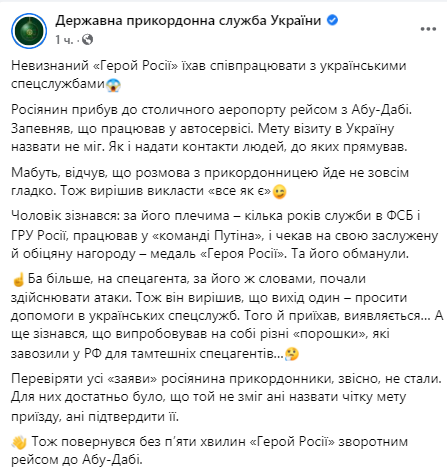 В Борисполе пограничники не пустили в Украину гражданина России, который заявлял, что он ранее служил в ФСБ и ГРУ РФ и работал в "команде президента РФ Владимира Путина", а сейчас из-за "атак" он едет сотрудничать с украинскими спецслужбами.
