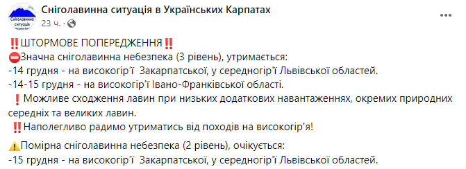 "Значительная снеголавинная опасность (3 уровень) - 15 декабря на высокогорье Ивано-Франковской области возможно схождение лавин… Возможен сход лавин при низких дополнительных нагрузках, отдельных природных средних и крупных лавин", - говорится в сообщении.