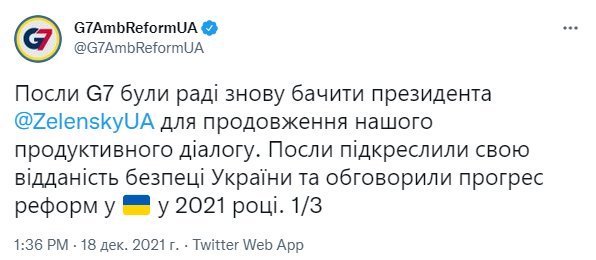 "Послы G7 были рады снова видеть президента Украины для продолжения нашего продуктивного диалога. Послы отметили свою приверженность безопасности Украины и обсудили прогресс реформ в Украине в 2021 году", — говорится в сообщении.