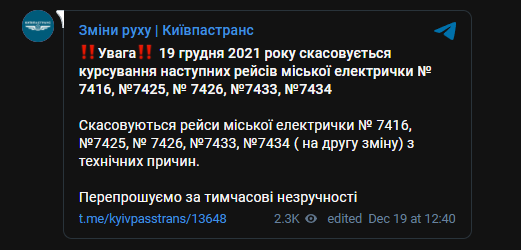 Об этом в своем Telegram-канале сообщает Киевпасстранс.