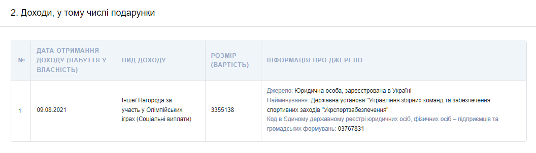 Также депутат 9 августа получил 3,3 млн гривен награды за участие в Олимпийских играх (социальные выплаты).