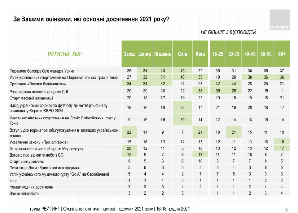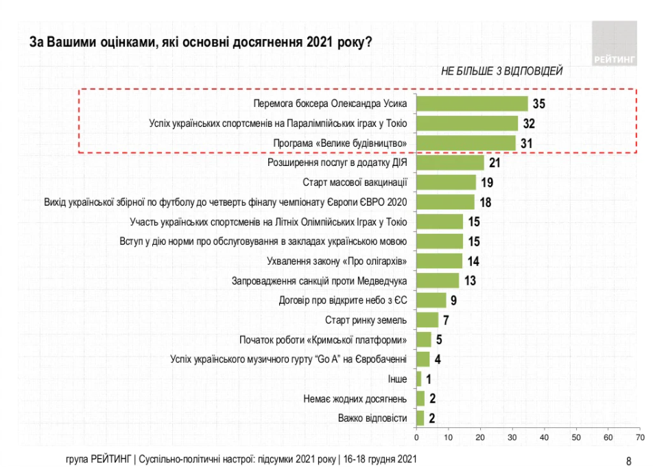 Также в топ-3 достижений Украины в уходящем году вошли успех украинских паралимпийцев в Токио (32%) и программа "Большое строительство" (31% ).