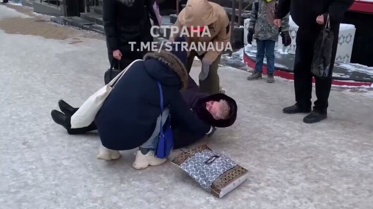 На видео, снятом корреспондентом "Страны", женщина травмировалась из-за падения на покрытом ледяной коркой тротуаре.