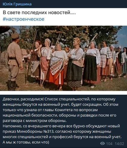 Также после вчерашнего приказа, в который внесли более 100 профессий военнообязанных женщин, в Верховной Раде заявили, что скандальный перечень решили сократить.