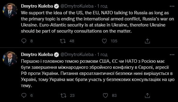 "Первой и главной темой разговора США, ЕС или НАТО с Россией должно быть завершение международного вооруженного конфликта в Европе, агрессии РФ против Украины. Вопрос евроатлантической безопасности сейчас решается в Украине, поэтому Украина должна участвовать в консультациях по безопасности на эту тему", - написал он.