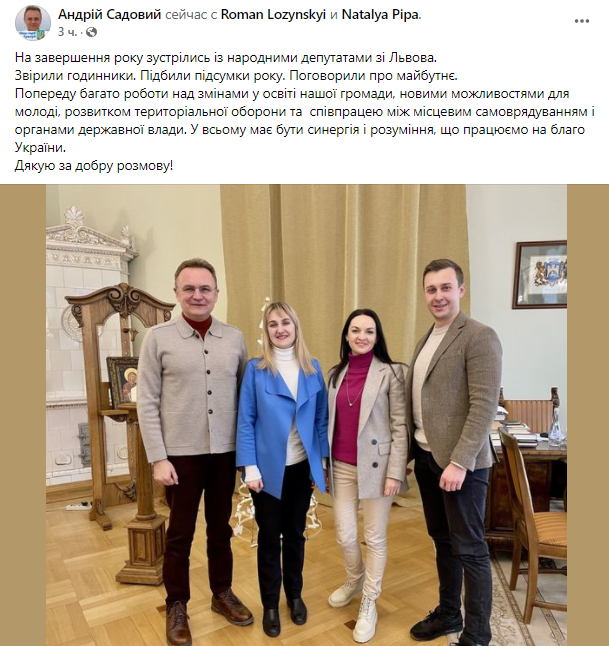 "В завершение года встретились с народными депутатами из Львова. Сверили часы. Подвели итоги года. Поговорили о будущем", - подписал фото львовский градоначальник.