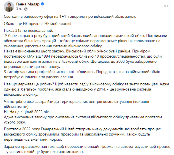 "Воинский учет женщин был и раньше. К примеру постановлением КМУ от 1994 г. предусматривалось около 40 профессий/специальностей, которые были основанием для взятия женщин на воинский учет. Что интересно, до 2008 года было запрещено обнародовать это постановление", - написал Маляр.