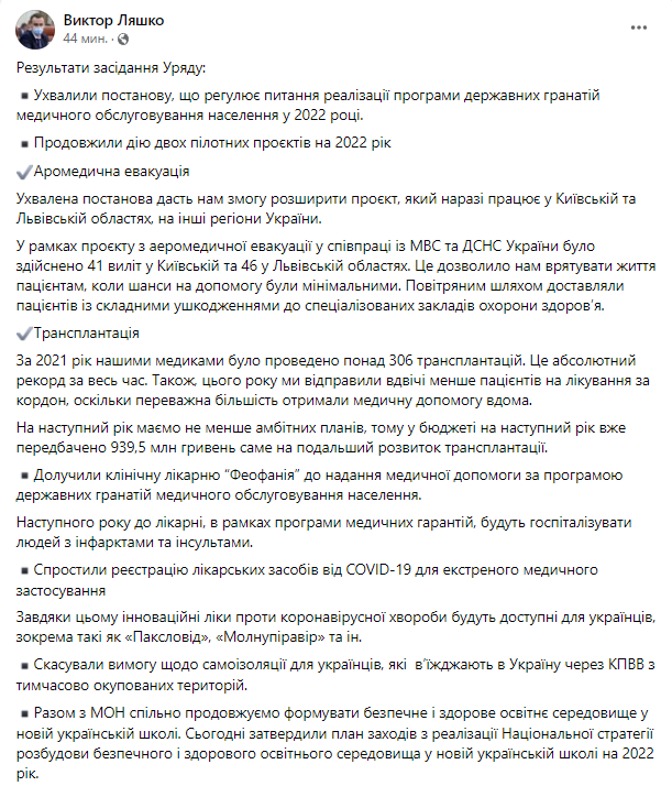 Об этом на своей Facebook-странице сообщил министр здравоохранения Виктор Ляшко.