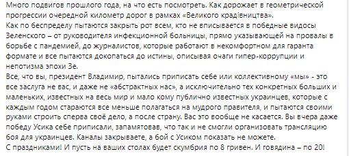 "Бредятина человека с дикой манией величия. Вместо того, чтоб говорить о вечном и важном, как все мировые лидеры, он о сиюминутном и все больше о себе. Позор. Пусть в Новом году он закончится! С Новым годом всех, кто ещё не встретил" - написал депутат от ОПЗЖ Олег Волошин.