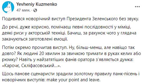 "Посмотрел новогоднее выступление Президента Зеленского без звука. Кстати, очень полезно, замечаешь некоторые последовательности в мимике, некоторые черты в актерской технике. Видишь, за счет чего у зрителя скачивают заготовленные эмоции.