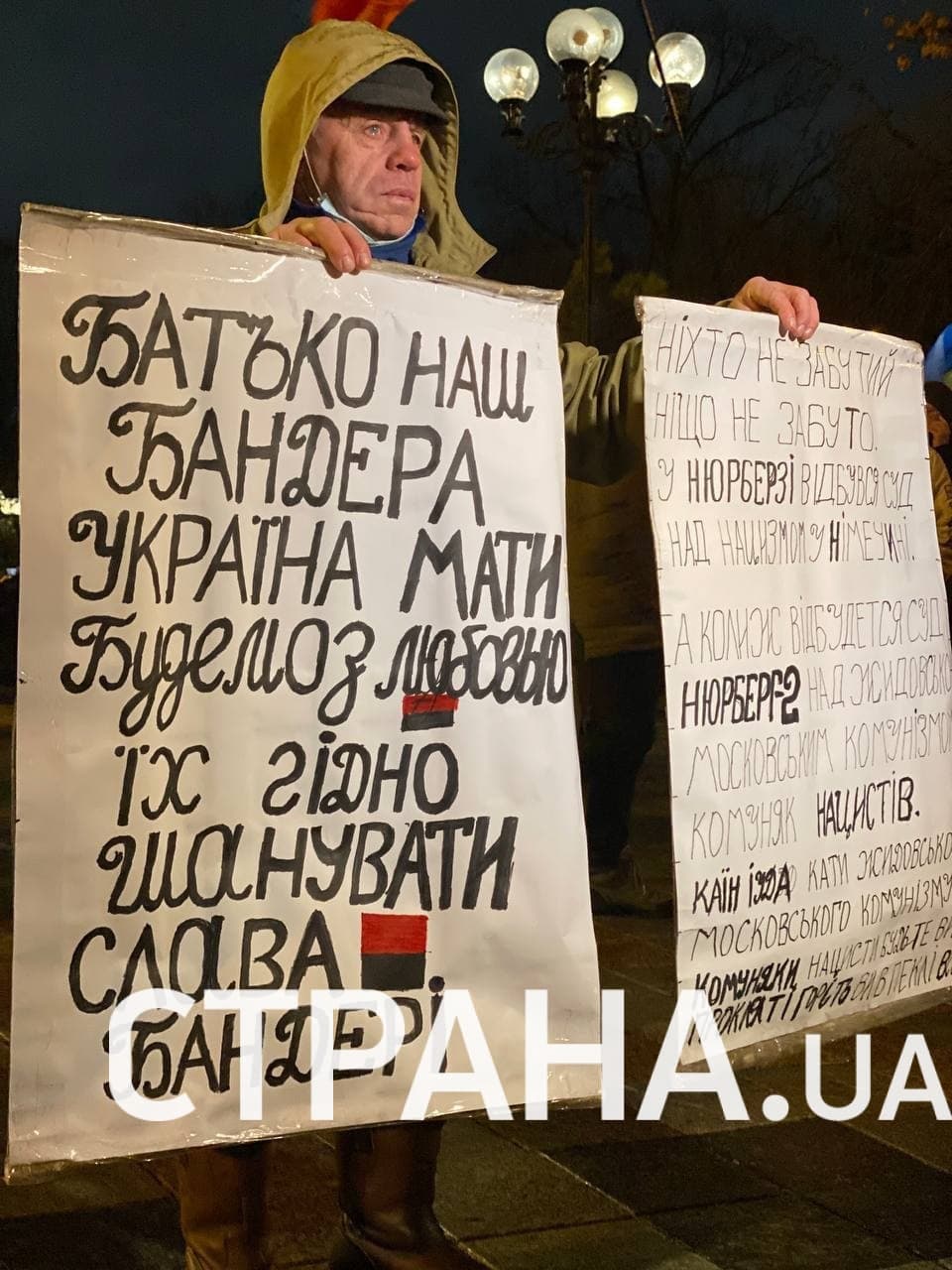 17:25  Лозунги сторонников Бандеры в этом году предсказуемы. Во-первых, песня "Батько наш Бандера", во-вторых коммунистическая речевка "Никто не забыт и ничто не забыто".