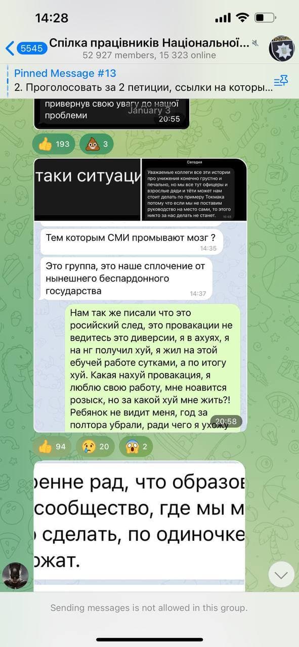 В распоряжение "Страны" оказались скрины сообщений из чата в телеграмме "Сообщество сотрудников национальной полиции Украины".
