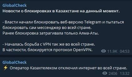 По данным GlobalCheck, власти начали блокировать веб-версию Telegram и пытаться блокировать сам мессенджер по всей стране. Ранее блокировка затрагивала только Алматы, где из-за "газовой революции" власти начали блокировать интернет и популярные мессенджеры.