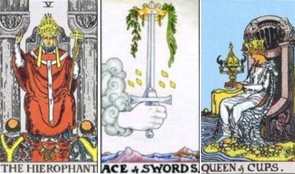 Карты, которые вам выпали - старший аркан Иерофант, младшие арканы - туз мечей и королева чаш.
