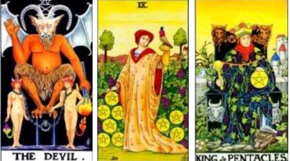 Ваши карты - старший аркан Дьявол. Младшие арканы девятка пентаклей (прибыль) и король пентаклей.
