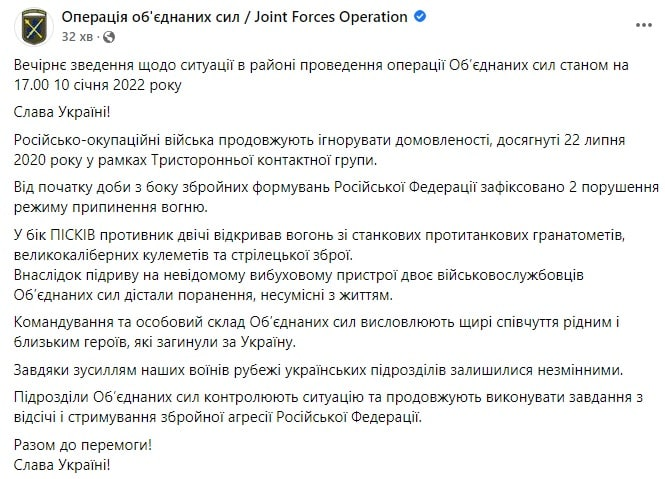 "С начала суток со стороны вооруженных формирований Российской Федерации зафиксировано 2 нарушения режима прекращения огня. В результате подрыва на неизвестном взрывном устройстве двое военнослужащих Объединенных сил получили ранения, несовместимые с жизнью. Командование и личный состав Объединенных сил выражают искренние соболезнования родным и близким героев, погибших за Украину", - указано в публикации.