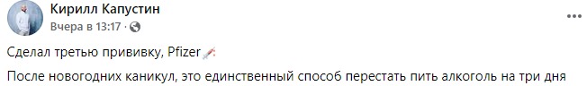 Радиоведущий Кирилл Капустин тоже сделал третью прививку Пфайзером и шутит, что "После новогодних каникул, это единственный способ перестать пить алкоголь на три дня".
