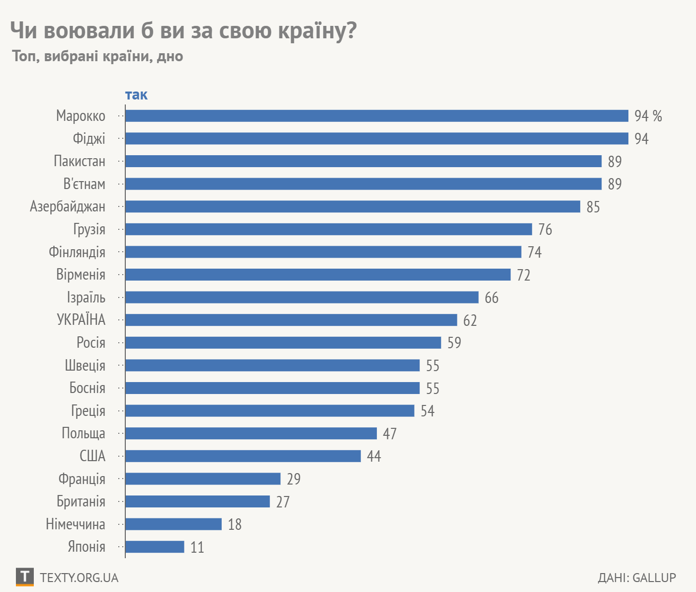 Аналогичные данные были у американской компании Gallup, которая в 2017 году провела глобальное исследование, как жители разных стран готовы к войне в случае агрессии.