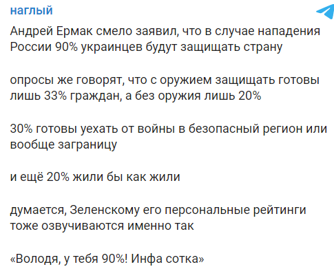 Раньше об этом несколько раз сообщал Зеленский, а сегодня на теме отметился Ермак. Он заявил, что воевать против России в случае начала войны будут 90% украинцев. То есть и женщины, и дети, и пенсионеры.