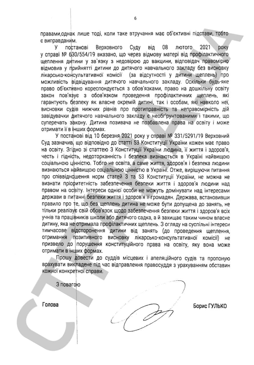 Перечень профессий, предприятий и производств, где необходима вакцинация против инфекционных болезней устанавливается центральным органом исполнительной власти, то есть МОЗ. Таким образом Кассационный суд признаёт законность приказа МОЗ #2153. Гулько отмечает, что законодательством не предусмотрено увольнение непривитого сотрудника, поэтому на время его отстранения за ним сохраняется его рабочее место. При этом законодательство не обязывает руководство предприятий или учреждений выплачивать зарплату отстранённым сотрудникам. Также в документе сказано, что эту позицию следует донести до всех местных и апелляционных судов и учитывать при принятии решений, исходя из обстоятельств каждого конкретного дела.