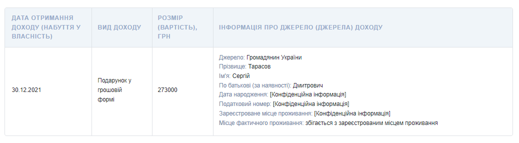 Согласно этим данным, 30 декабря депутат получил в подарок от 273 000 гривен. Денежный сюрприз нардепу сделал Сергей Тарасов. Отметим, что отчество депутата - Сергеевич, и их фамилии совпадают.