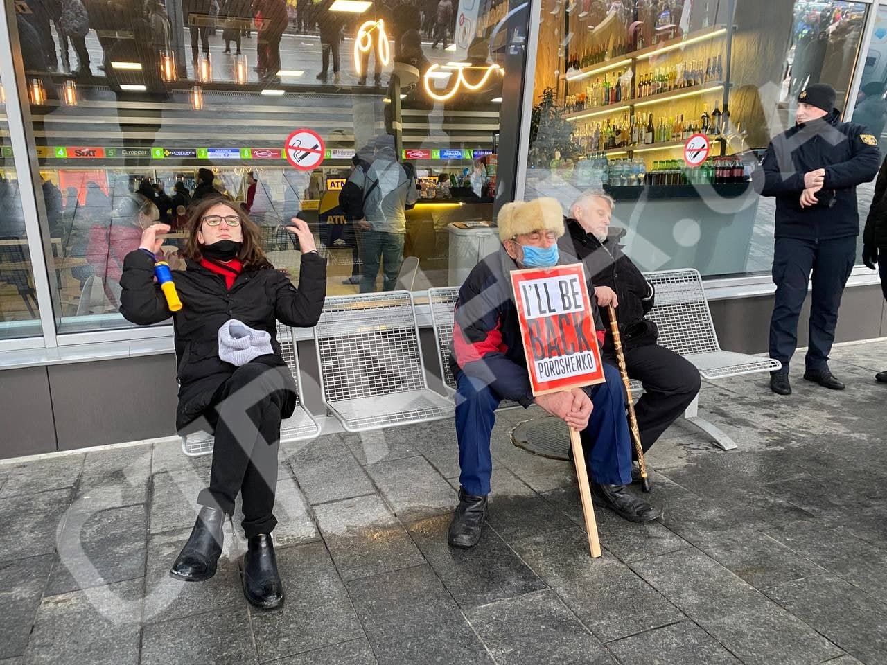 08:40 В "Жулянах" встречающие держат плакаты с надписями "Стране нужен Порох", "Руки прочь от Пороха" и "Стоп репрессиям". На площади перед терминалом прибытия поставили экран.