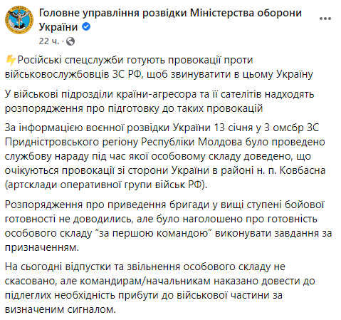 "По информации военной разведки Украины 13 января в 3 омсбр ВС (третья отдельная мотострелковая бригада - Ред.) Приднестровского региона Республики Молдова было проведено служебное совещание, в ходе которого личному составу доложено, что ожидаются провокации со стороны Украины в районе н. п. Колбасна (артсоставы оперативной группы войск РФ)", - сообщили в ГУР.