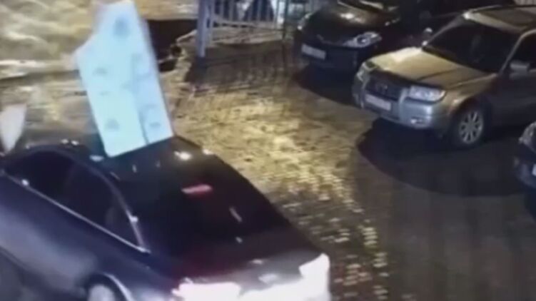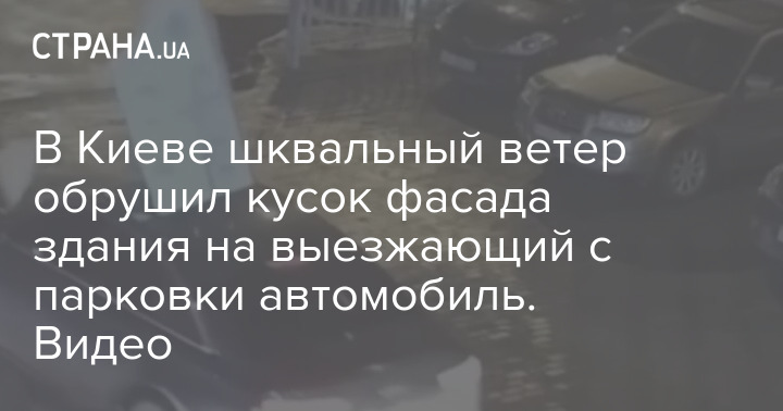 В Киеве шквальный ветер обрушил кусок фасада здания на выезжающий с парковки автомобиль. Видео